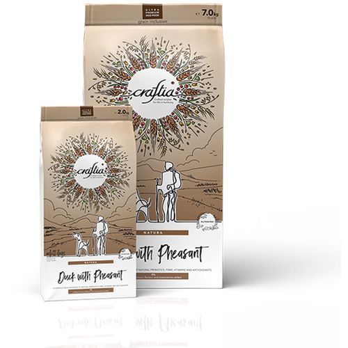 Craftia Natura je ultra premium hrana za pse sa visokim saržajem sveže obrađenog mesa. Najzastupljenije meso je meso pačetine i fazana. Podržava normalno funkcionisanje celog sistema kod pasa.