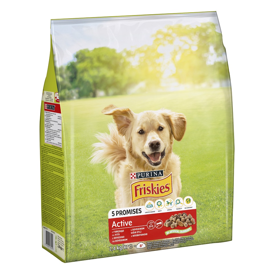 Potpuna hrana za odrasle aktivne pse. Friskies Active je potpun obrok sa dodatkom B-vitamina da bi pomogao održavanju nivoa energije radi boljeg savladavanja prepreka u okolini tokom igre.